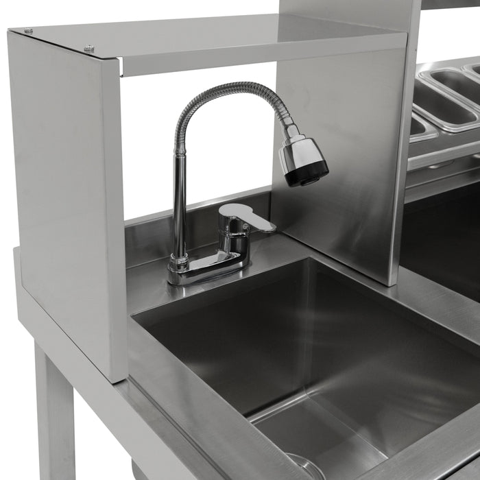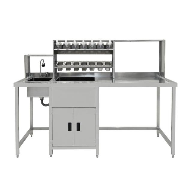 L'igiene è una priorità assoluta in questa postazione progettata con cura. Il lavello integrato, dotato di rubinetto flessibile, vassoio gocciolatoio e rinfrescatore per bicchieri, rende la pulizia e il risciacquo rapidi e senza sforzo. Che si tratti di rinfrescare bicchieri, risciacquare strumenti o riordinare dopo un periodo intenso, queste caratteristiche vi aiutano a mantenere standard di pulizia impeccabili durante tutta la giornata. Realizzata in acciaio inossidabile, la postazione non è solo elegante nell'aspetto ma anche resistente all'usura, alle macchie e ai versamenti, rendendola facile da pulire e perfetta per un uso quotidiano intensivo.