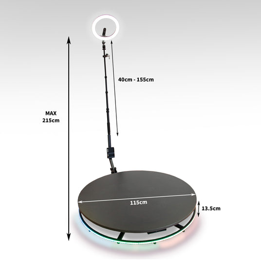 Azionato a telecomando; gli ospiti possono catturare il momento perfetto con un semplice clic. Compatibile con diversi dispositivi tra cui telefoni, tablet, fotocamere DSLR e GoPro, ciascuno con il proprio accessorio di supporto incluso, questa cabina fotografica è super versatile. In grado di personalizzare la velocità, la direzione o accendere o spegnere la macchina, questo telecomando consente all’utente di personalizzare la propria esperienza. Il braccio può essere regolato tra 40 cm e 155 cm e con un angolo da 36 a 156 gradi, ideale per catturare una vasta gamma immagini di prodotti o persone di tutte le altezze.