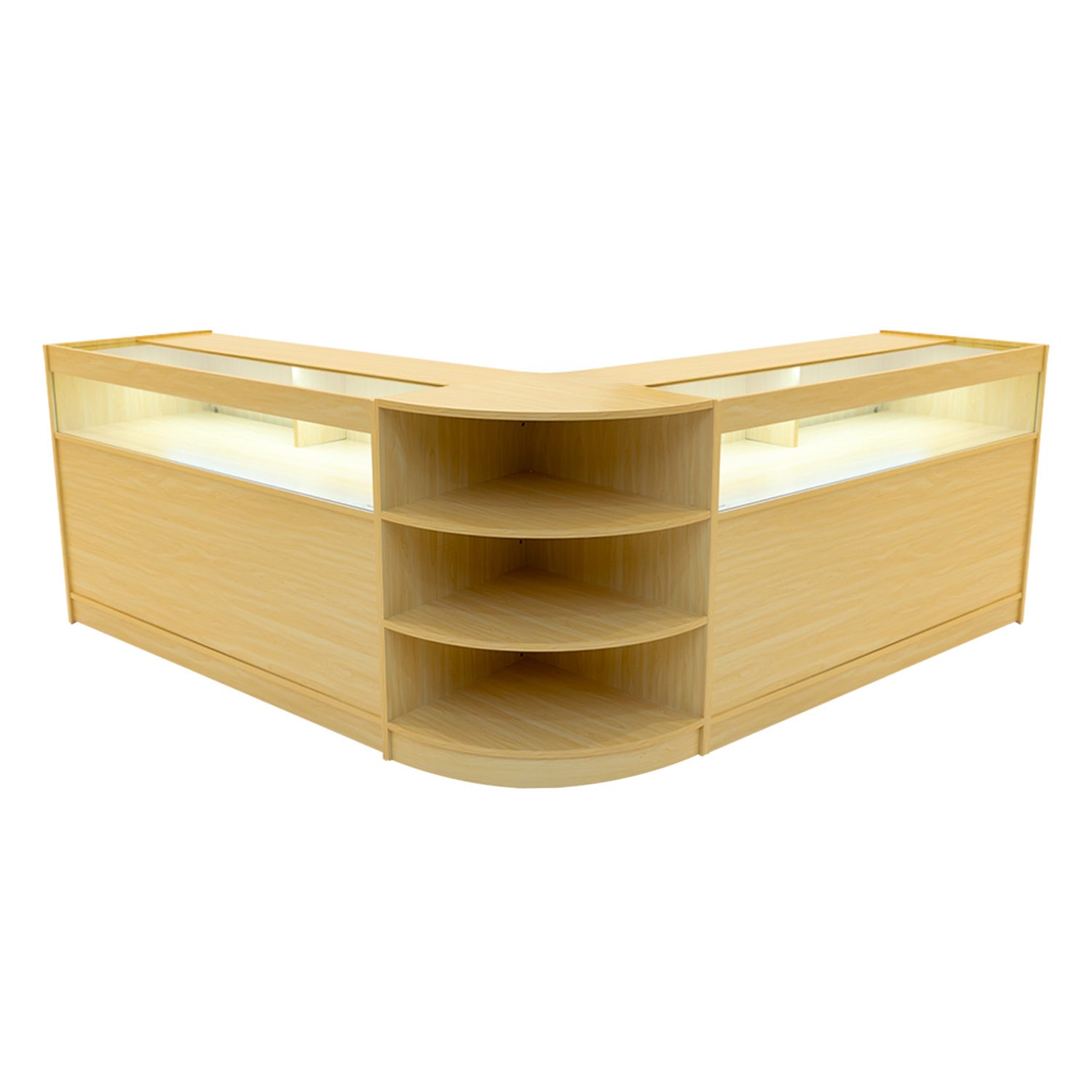 Il bancone angolare LM60 completa la configurazione migliorando l’ottimizzazione degli spazi. Il suo design curvo consente un’installazione fluida negli angoli o tra moduli lineari, creando un layout armonioso. I tre ripiani aperti sul lato cliente assicurano visibilità e facile accesso ai prodotti esposti.