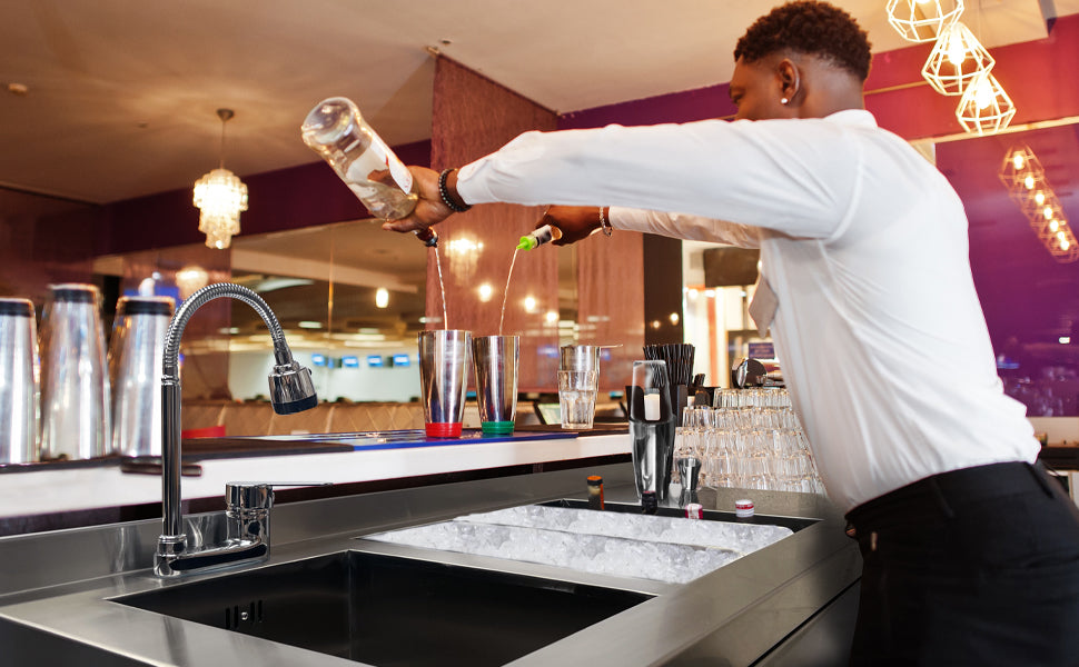 Realizzata in acciaio inossidabile #304 di alta qualità per uso alimentare, questa larga stazione da bar è estremamente resistente e facile da pulire. Il lavello integrato arriva dotato di un rubinetto miscelatore girevole a 360 gradi, che garantisce un lavaggio semplice e senza problemi, tutta la tua attrezzatura è sempre pronta all'azione.