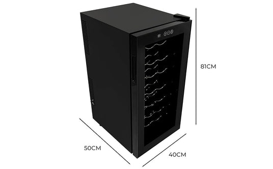 Elegante cantinetta vino da 78 litri per conservare fino a 28 bottiglie alla temperatura ideale. Struttura compatta (81 cm altezza x 50 cm profondità x 40 cm larghezza) con porta in vetro, controllo touch e ripiani sagomati per bottiglie. Ideale per cucine moderne, bar o angoli degustazione.