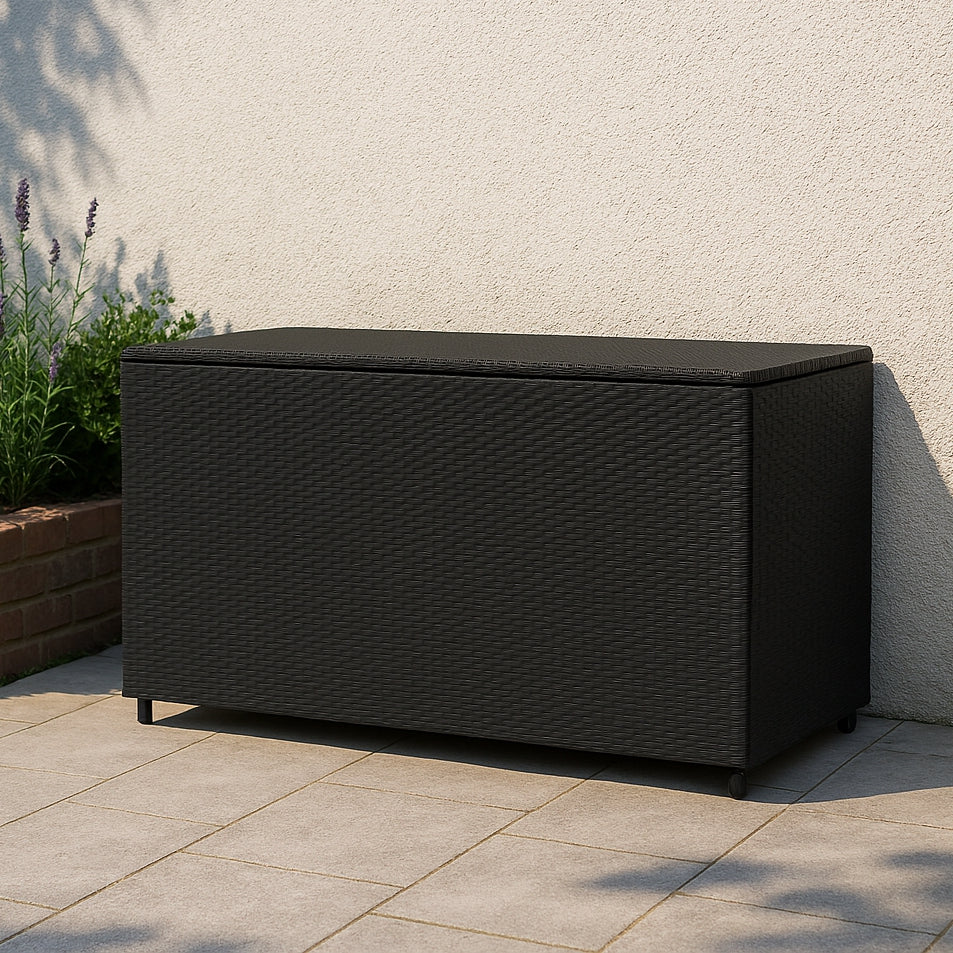 Il robusto telaio in acciaio con rivestimento in polvere, abbinato a una splendida finitura nera in rattan resistente ai raggi UV, non solo garantisce una durata senza pari ma crea anche un'estetica moderna e sofisticata per esterni. Il rivestimento interno impermeabile contribuisce a prolungare la durata del baule e a preservare il contenuto, proteggendolo dalle diverse condizioni atmosferiche.