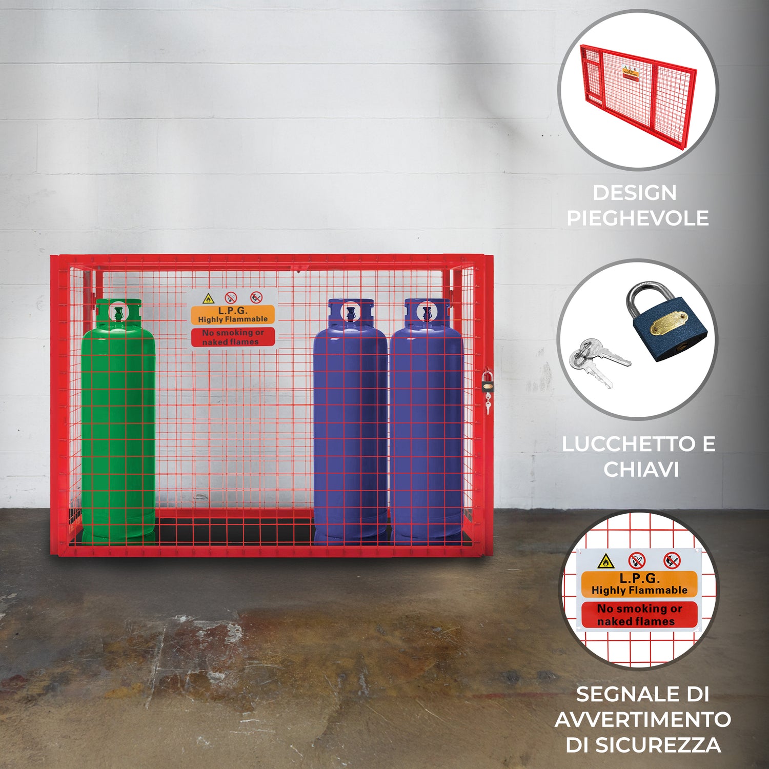 La gabbia può contenere fino a quattro bombole standard da 19kg, ottimizzando lo spazio senza risultare ingombrante. La sicurezza è una priorità: la struttura è dotata di lucchetto con 2 chiavi per prevenire accessi non autorizzati e di cartello di avviso ben visibile, per segnalare le precauzioni necessarie.