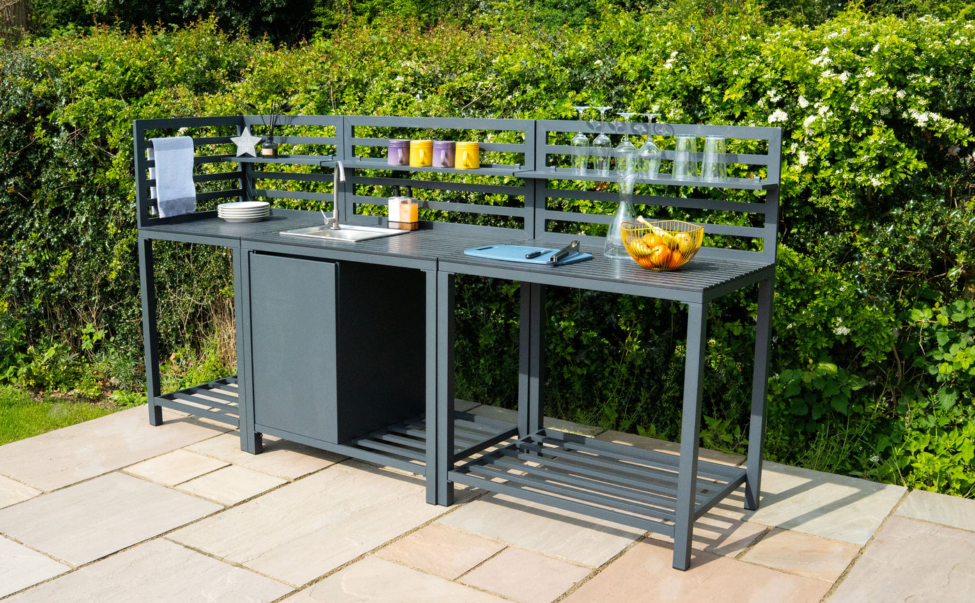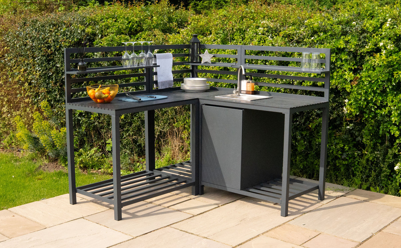 Realizzato in resistente alluminio verniciato a polvere con una sofisticata finitura antracite, il set garantisce durabilità contro gli agenti atmosferici mantenendo un'estetica moderna e discreta. Comprende un modulo lavello completo di lavabo in acciaio inox e rubinetto, un modulo angolare e un ampio modulo tavolo. La disposizione modulare consente di installarlo in linea retta o ad angolo, adattandosi facilmente al tuo spazio e alle tue esigenze.