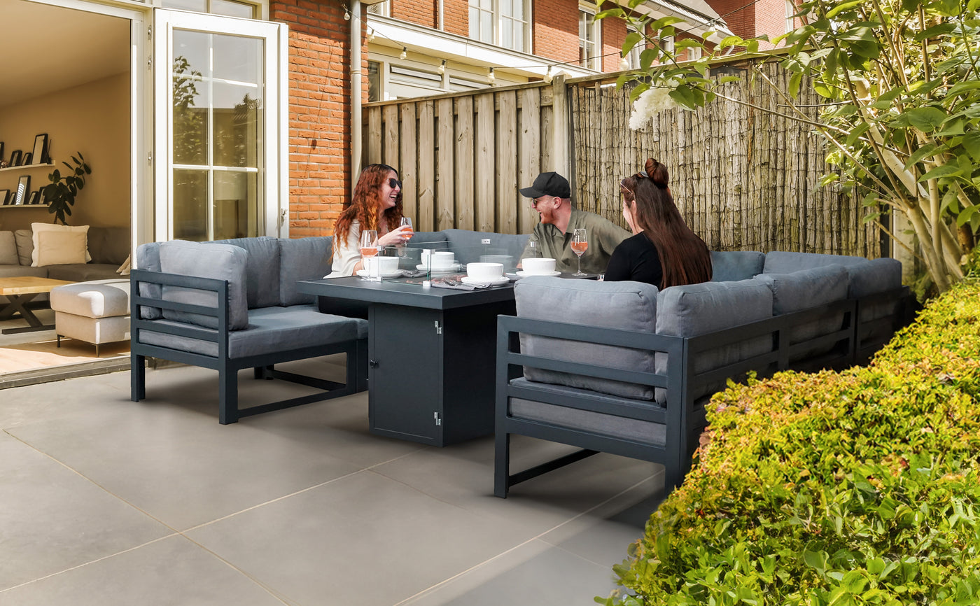 Il cuore del set è il tavolo con braciere integrato, dal design ingegnoso e raffinato. Riempito con autentiche rocce vulcaniche naturali, crea un’atmosfera accogliente e calda, diventando il punto focale ideale per serate rilassanti o conviviali. Il piano d’appoggio ampio offre spazio sufficiente per cene all’aperto o aperitivi con amici, mentre la bombola del gas resta nascosta all’interno del tavolo per un’estetica pulita e ordinata.