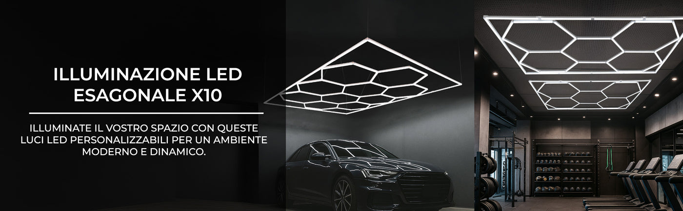 Dai nuova luce ai tuoi spazi con il nostro innovativo sistema modulare LED Esagonale x10 – una combinazione perfetta di design d’impatto e illuminazione ad alte prestazioni.