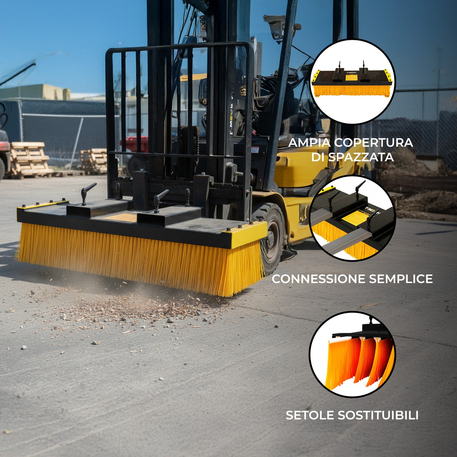 Ideale per superfici lisce e interne, questa soluzione trasforma il tuo carrello elevatore in uno strumento di pulizia potente: perfetta per rimuovere polvere, detriti da imballaggi e sporco generico in modo semplice e costante.